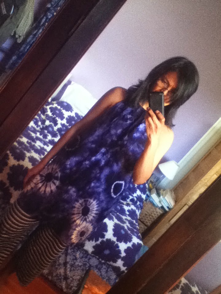 this first ensemble is a tunic tie dye dress over a pair of striped cotton elastic waisted pants